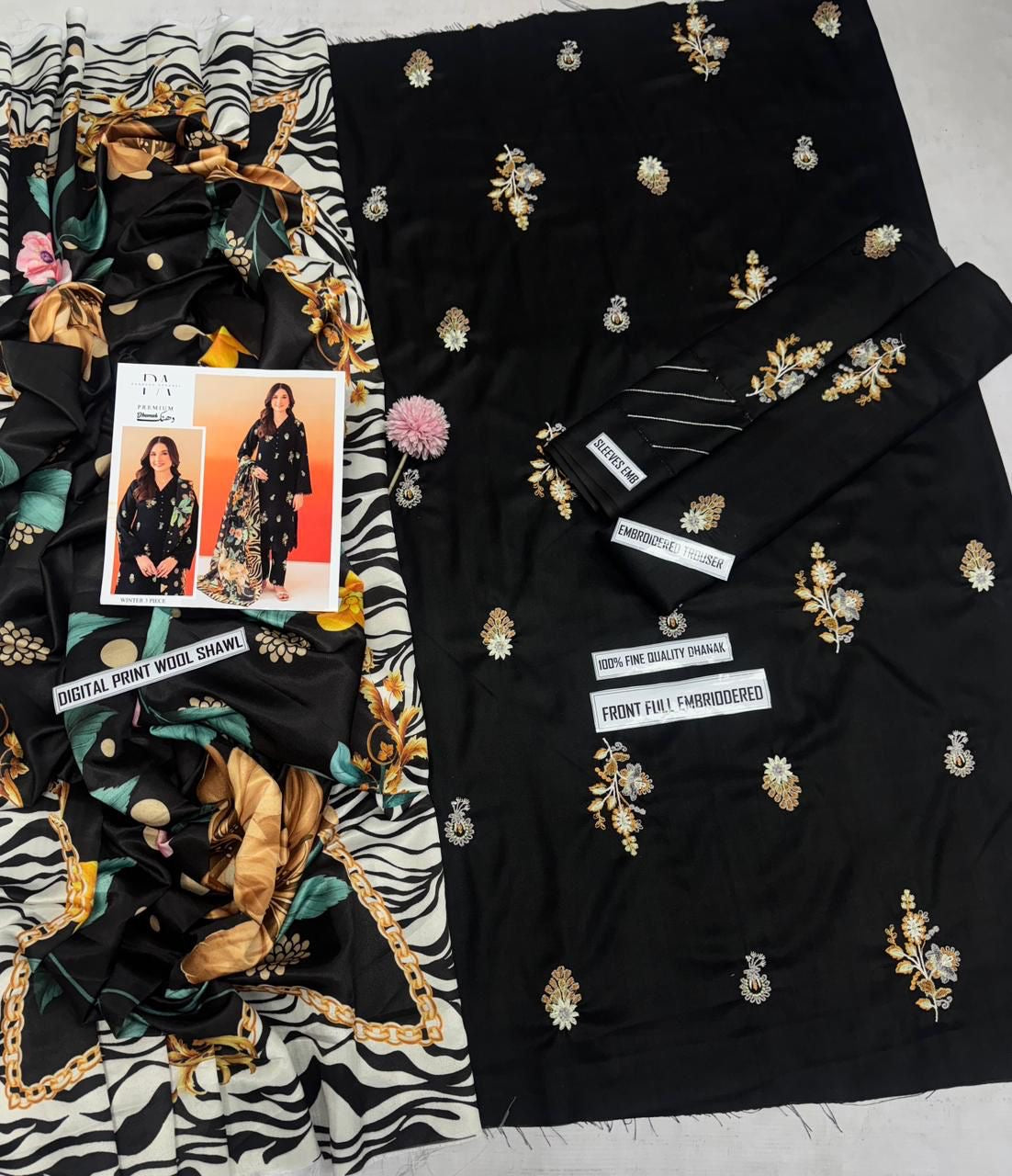 SHEIN dhanak embroidered & wool cambric printed shawl unstitced 3pc